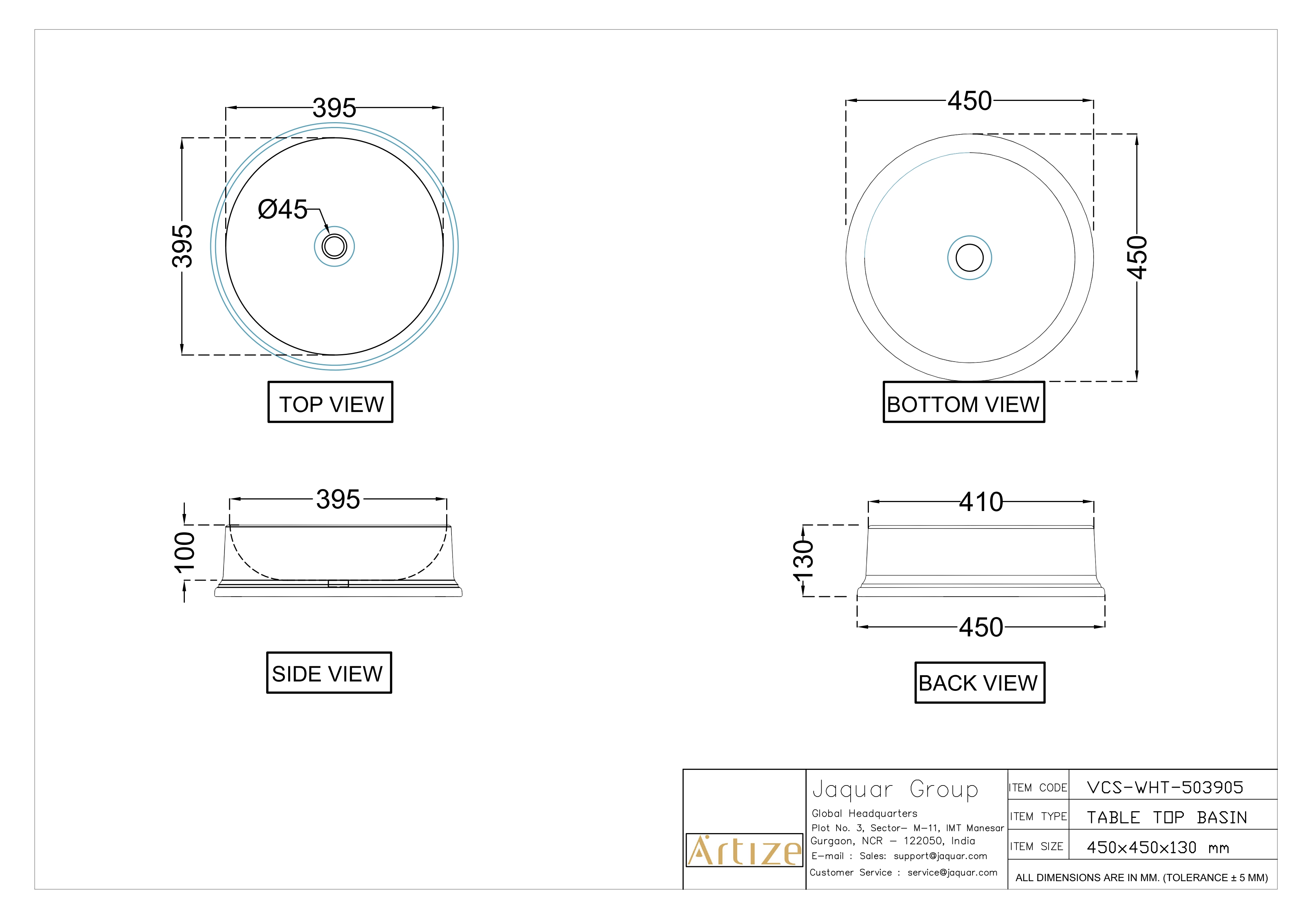 Table top basin, Size : 450 x 450 x 130 mm, Shape : Round