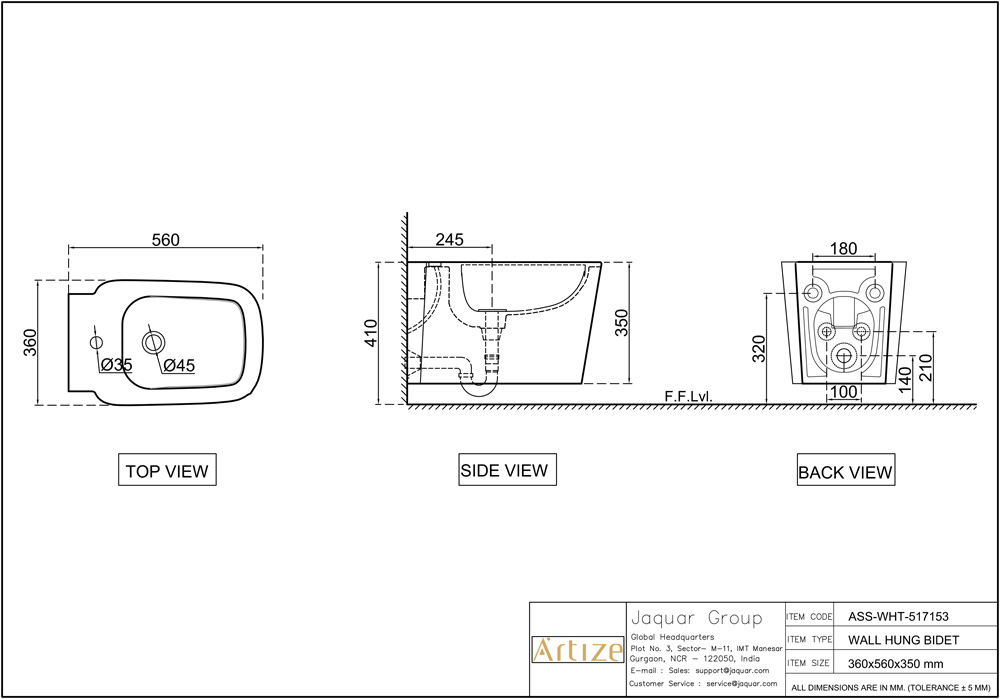 Wall Hung Bidet With Accessories Set, Size: 360×560×350 mm