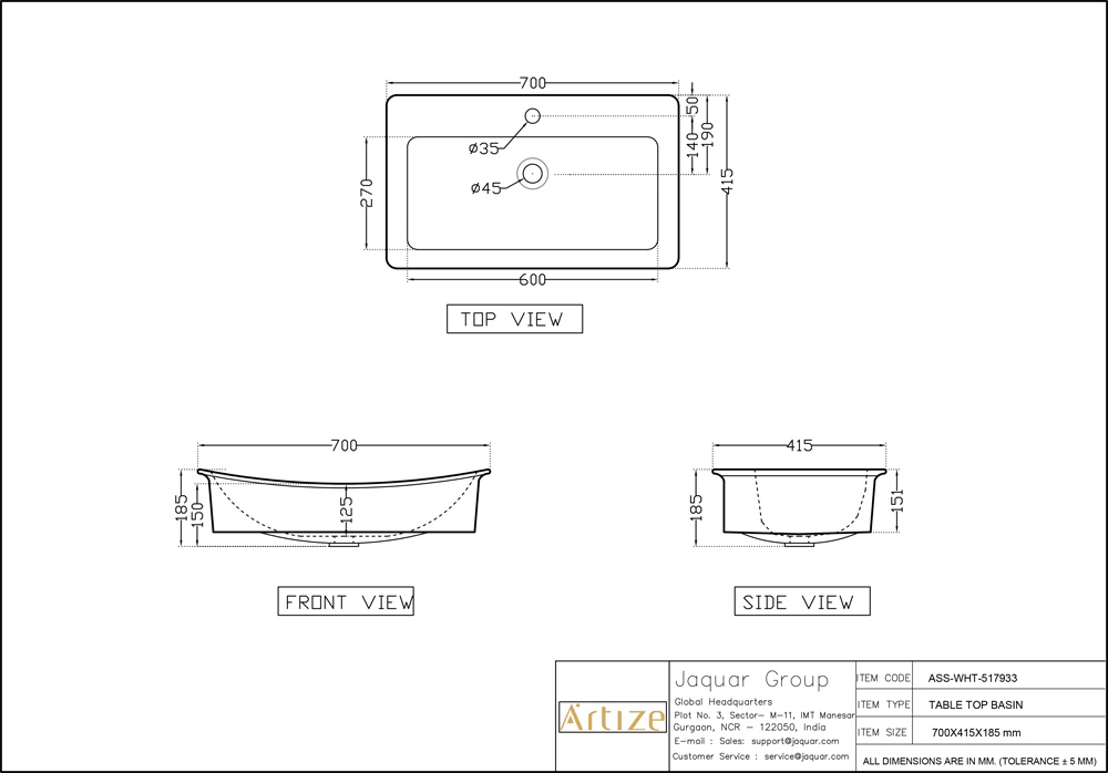 Table Top Basin (with Tap Hole), Size:700X415X185mm